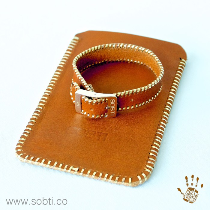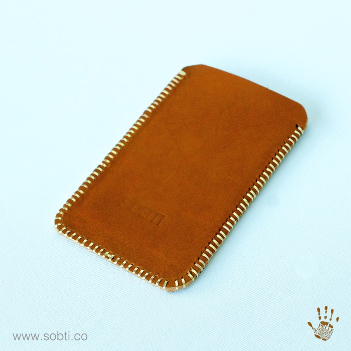 i. Handmade Italian vegetable tanned leather smartphone sleeve. Made from the finest leather sourced from tanneries registered with the Italian vegetable tanned leather consortium and stitched with 9K Gold wiring. For this model, I used 2 layers of leather to craft the smartphone sleeve and this fits in for an Apple iPhone 6S plus. And my partner, Paolo Lapini from Italy, stitched the smartphone sleeve with 9k Gold wiring.